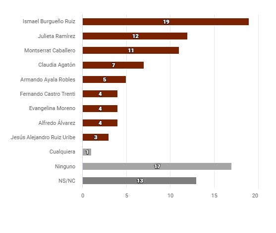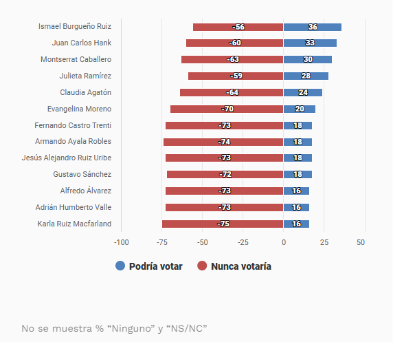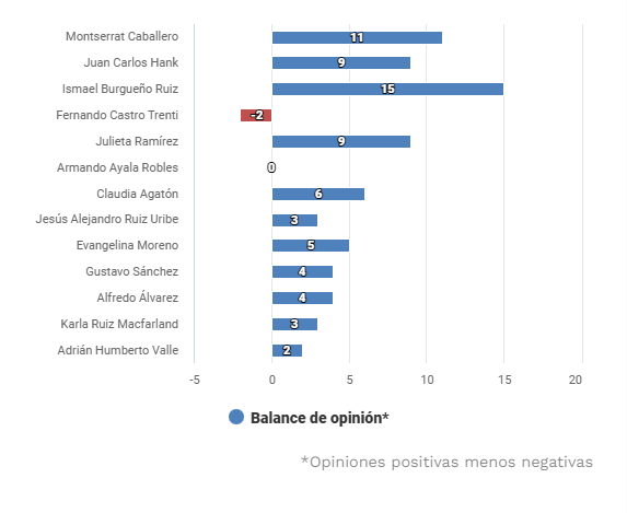 Ismael Burgueño tiene el saldo de opinión más favorable (+15). Le siguen Montserrat Caballero (+11), Juan Carlos Hank (+9), Julieta Ramírez (+9) y Claudia Agatón (+6).