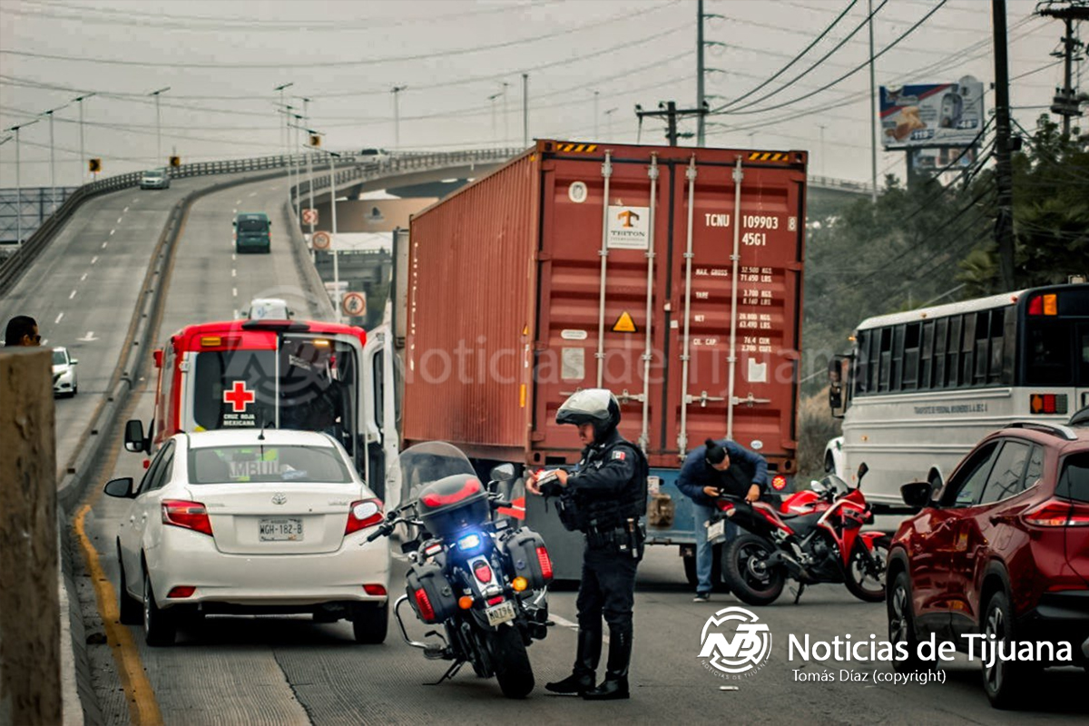 Un motociclista resultó gravemente herido tras sufrir un accidente en el Nodo Morelos. Según los primeros reportes, la motocicleta colisionó con un Toyota Yaris, lo que provocó que el conductor cayera debajo de un tráiler, el cual le pasó por encima de las piernas.
