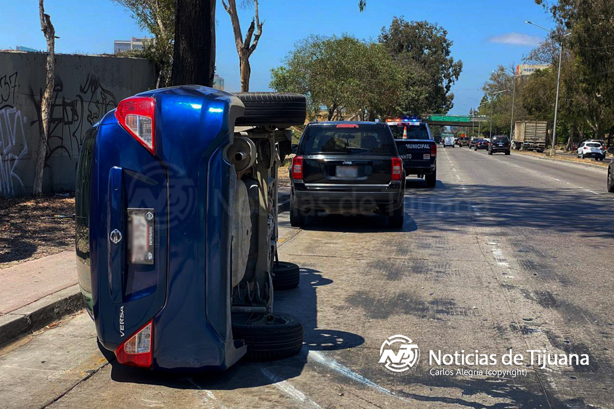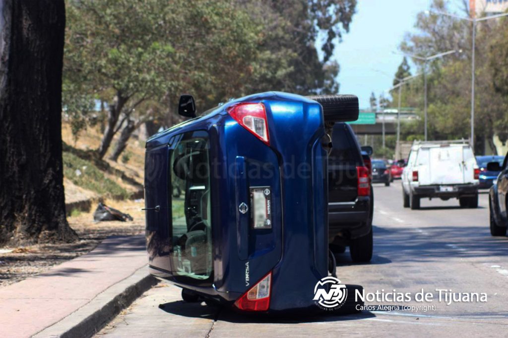 Un Nissan Versa volcó la tarde de este sábado, luego de un fuerte choque provocado por una conductora de una camioneta Jeep Patriot con placas de California que no tomó precauciones al cambiar de carril, impactando el vehículo de costado.