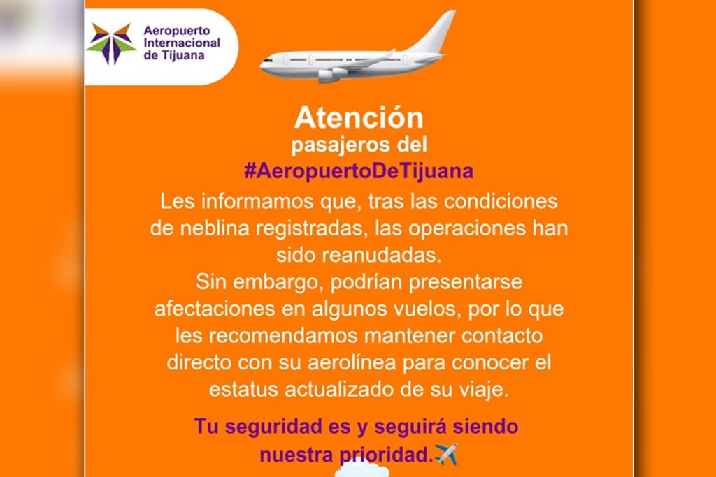 El Aeropuerto Internacional Abelardo L. Rodríguez suspendió operaciones durante la noche debido a la neblina que redujo la visibilidad e impidió realizar maniobras aéreas con seguridad en Tijuana.