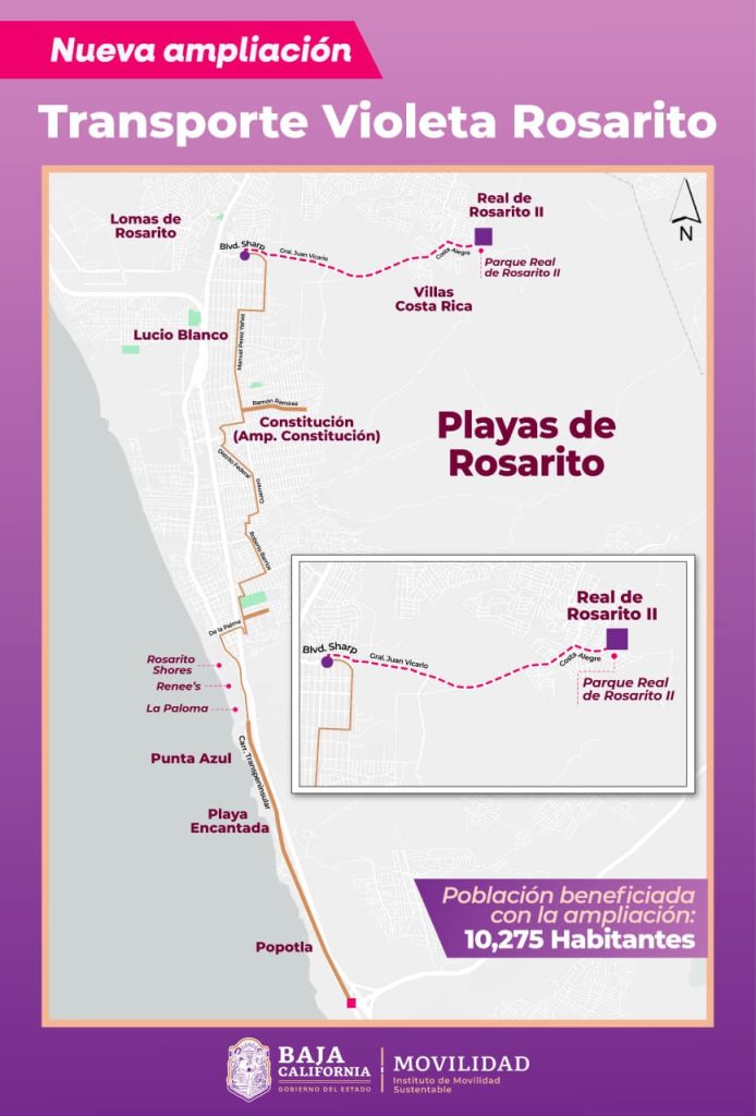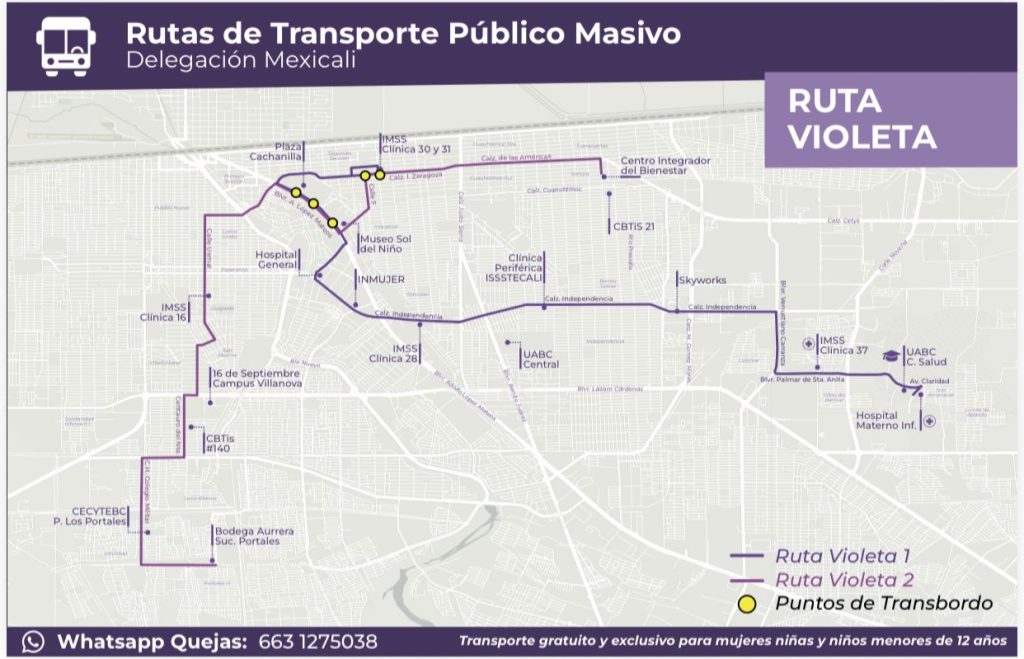 Uno de los proyectos prioritarios es el programa “Transporte Violeta”, un servicio gratuito dirigido a mujeres y a sus hijos menores de 12 años, que actualmente opera con 47 unidades distribuidas en 10 rutas en los municipios de Tijuana, Mexicali, Tecate, Ensenada y Playas de Rosarito. Durante 2025, este sistema superó los 10 millones de abordajes sin costo.