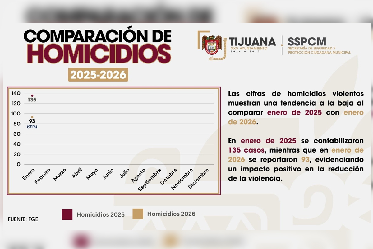 Durante el mes de enero de 2026, Tijuana registró una disminución en los homicidios violentos, de acuerdo con cifras preliminares de la Fiscalía General del Estado, que reportan 93 casos, frente a los 135 ocurridos en el mismo periodo de 2025.