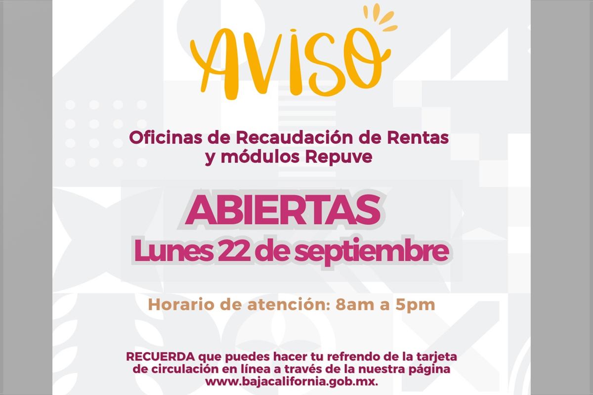 A pesar de que el próximo lunes 22 de septiembre las oficinas de Gobierno del Estado permanecerán cerradas por el aniversario de creación del Sindicato de Trabajadores, el Servicio de Administración Tributaria de Baja California (SAT BC) informó que las oficinas de recaudación de rentas y los módulos del Repuve sí estarán brindando atención al público.