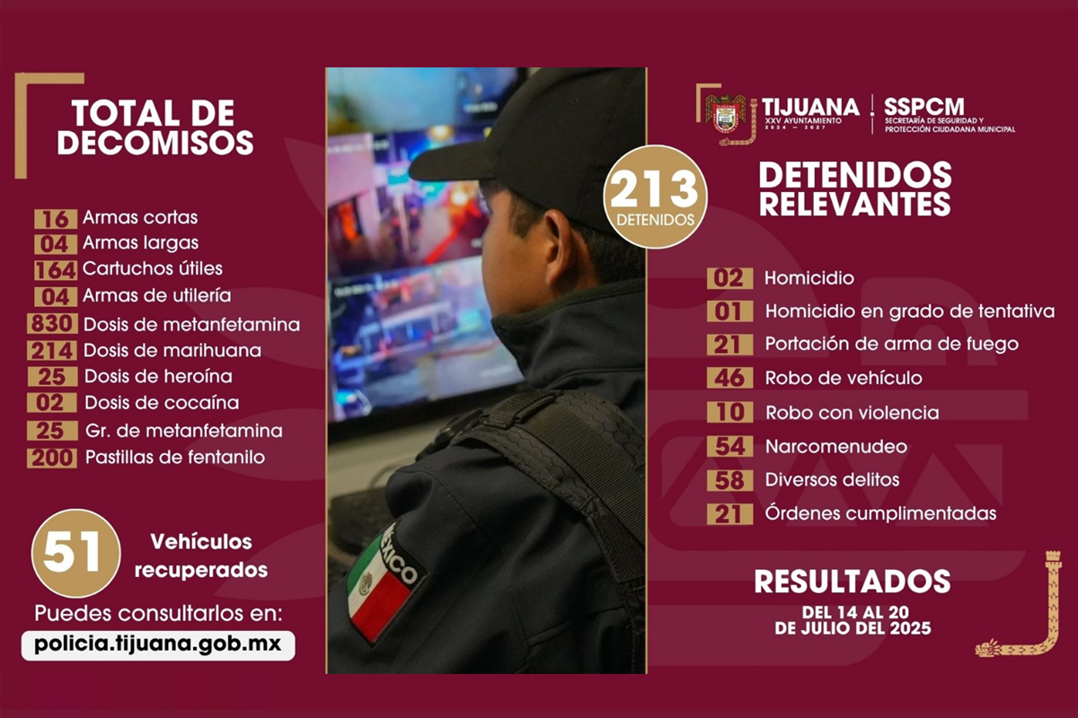 La Policía Municipal de Tijuana detuvo a 213 personas vinculadas a diversos delitos, además de sacar de circulación 20 armas de fuego, drogas y recuperar 51 vehículos robados, entre el 14 y 20 de julio.