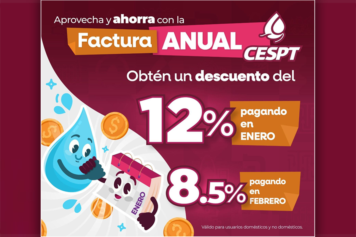La Comisión Estatal de Servicios Públicos de Tijuana (CESPT) invita a las y los usuarios a aprovechar los descuentos disponibles por el pago anticipado del servicio de agua potable.