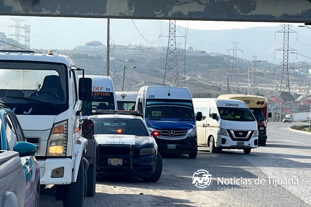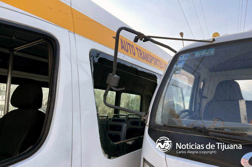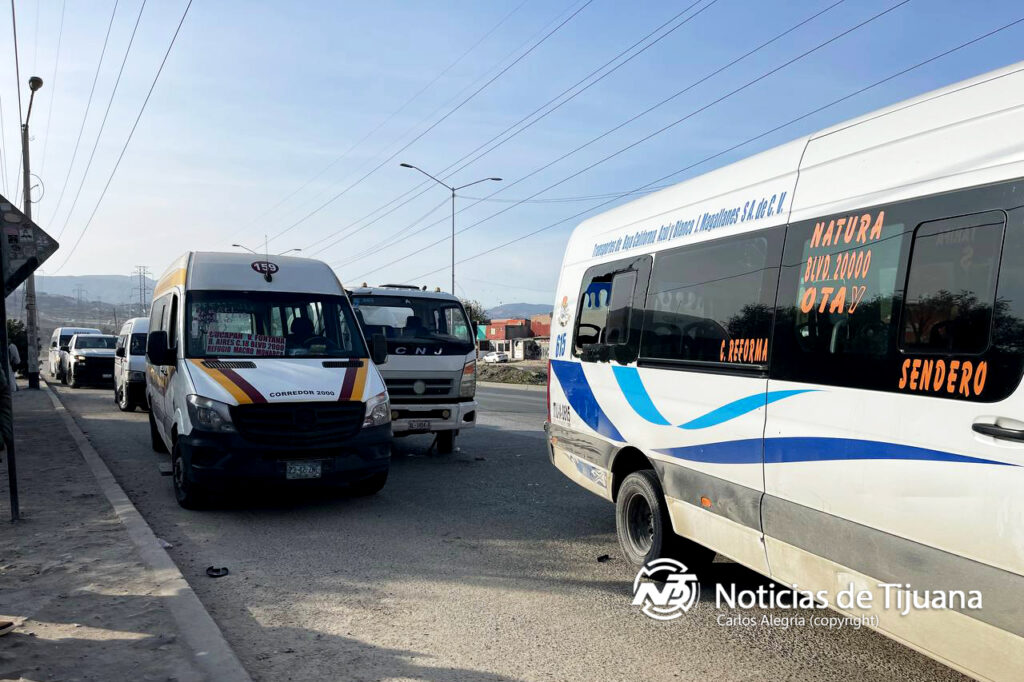 Tijuana BC. _ Un camión de gas estacionario impactó a dos unidades de transporte público la mañana del martes 18 de febrero, en el fraccionamiento Hacienda Santa María, tras una mala maniobra al intentar incorporarse al bulevar 2000.