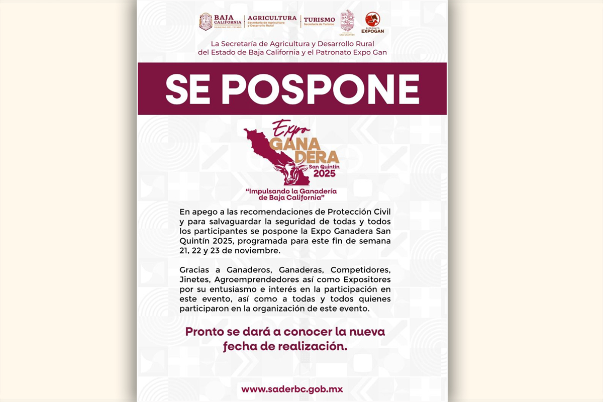La Secretaría de Agricultura y Desarrollo Rural de Baja California (SADER BC) , el Patronato Expo Gan, y el Ayuntamiento de San Quintín han tomado esta decisión con el fin de garantizar la seguridad de los jinetes, expositores, agroemprendedores y asistentes que participan en este importante evento.