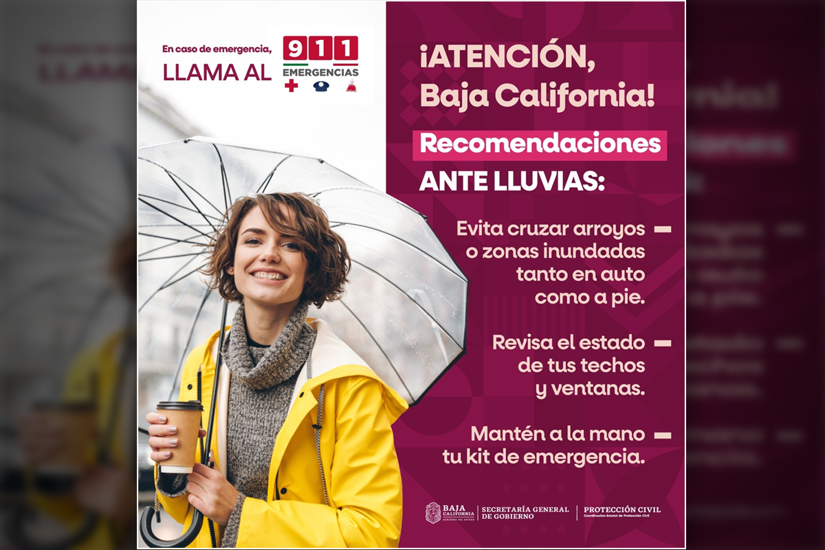 La Coordinación Estatal de Protección Civil (CEPC) informa que de acuerdo a los pronósticos del Servicio Meteorológico Nacional (SMN) se espera el ingreso de humedad proveniente del Pacífico y un frente frío, que podría generar condiciones de lloviznas y lluvias ligeras para Baja California a partir de la tarde de este lunes 13 de octubre.