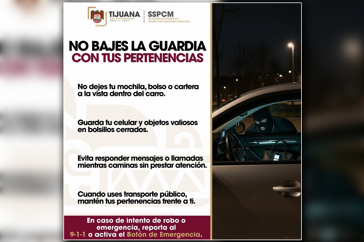 La Secretaría de Seguridad y Protección Ciudadana Municipal (SSPCM) emitió una serie de recomendaciones para reducir el riesgo de robos en la vía pública, dirigidas a personas que transitan por calles, avenidas y espacios públicos de Tijuana.