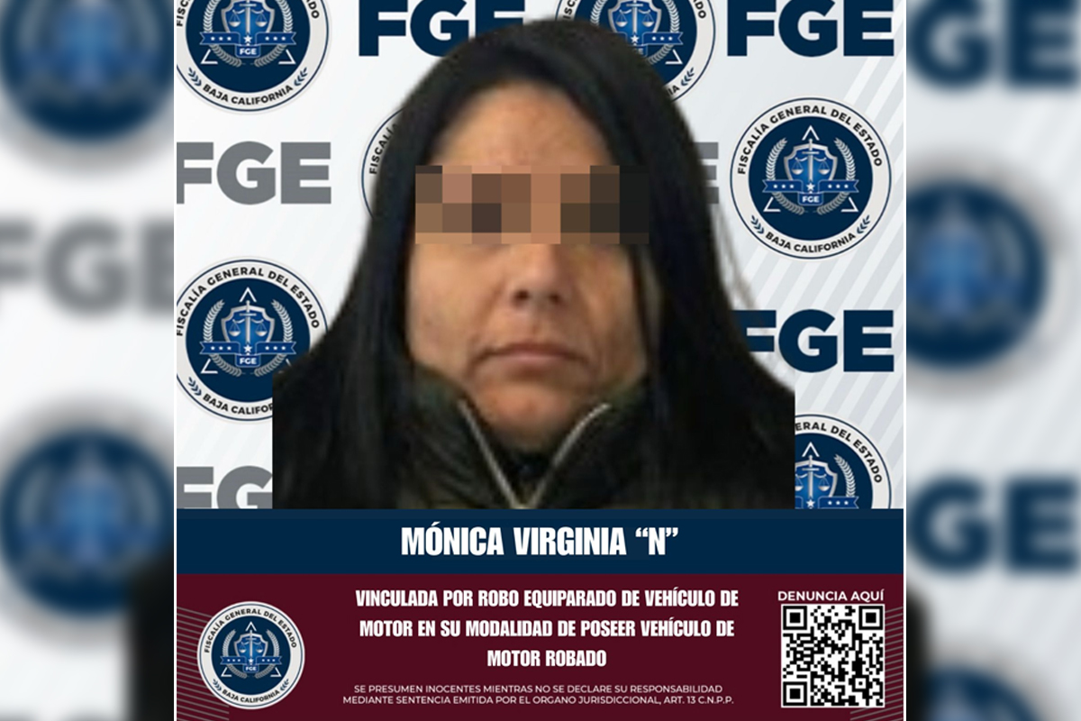 La Fiscalía Regional de Tecate obtuvo la vinculación a proceso de Mónica Virginia “N”, acusada del delito de robo equiparado de vehículo de motor, en su modalidad de posesión de vehículo de motor robado.