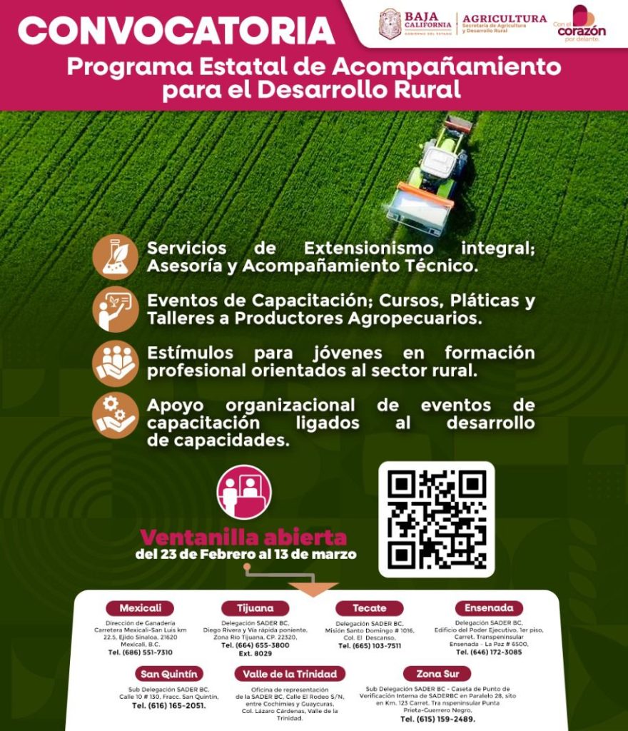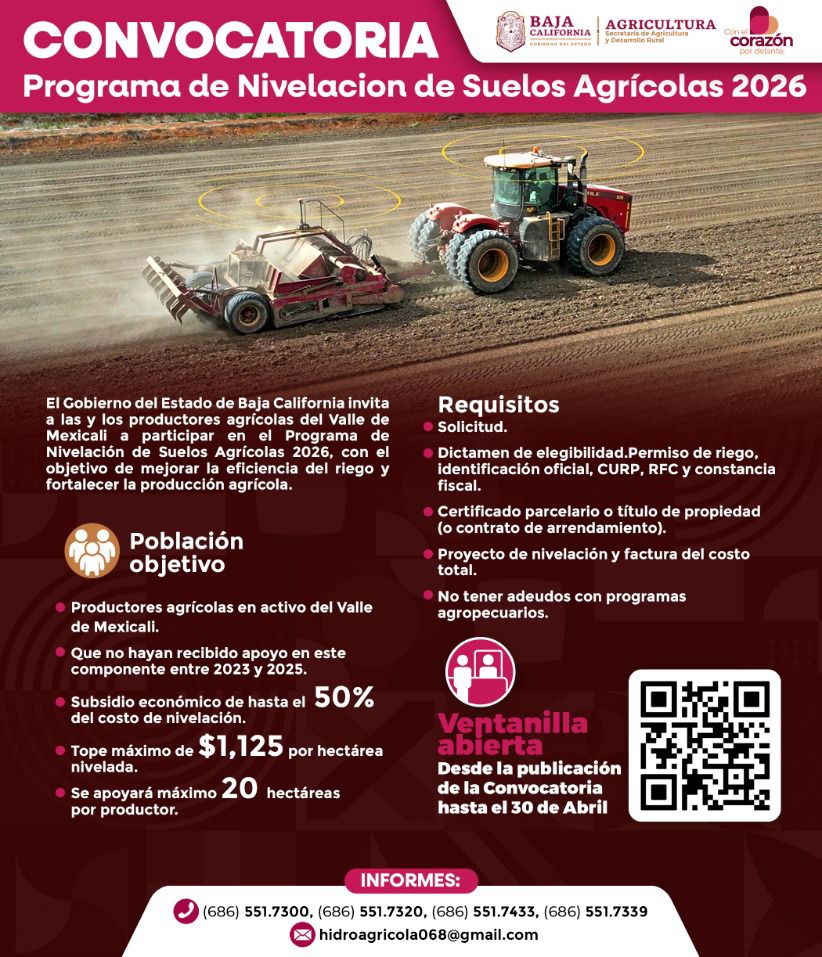 La Secretaría de Agricultura y Desarrollo Rural de Baja California (SADER BC) mantiene abierta la recepción de solicitudes para distintos programas enfocados en mejorar la productividad del campo, entre ellos el de nivelación de suelos agrícolas, Fortalecimiento Agrícola, Ganadería Integral y Acompañamiento para el Desarrollo Rural.