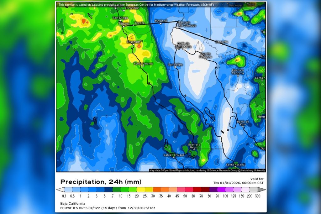 El pronóstico indica la probabilidad de rachas fuertes de viento, lluvias intensas e intervalos de chubascos en el estado, así como la posible caída de nieve o aguanieve durante la noche en la sierra de San Pedro Mártir. Se prevé que durante la tarde del jueves 1 de enero de 2026 la vaguada comience a debilitarse, lo que permitiría una disminución gradual en la intensidad de las precipitaciones.