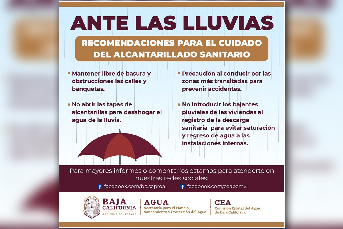 Ante el pronóstico de lluvias en Baja California, la Secretaría para el Manejo, Saneamiento y Protección del Agua (SEPROA) emitió una serie de recomendaciones para prevenir inundaciones y reducir riesgos para la población.