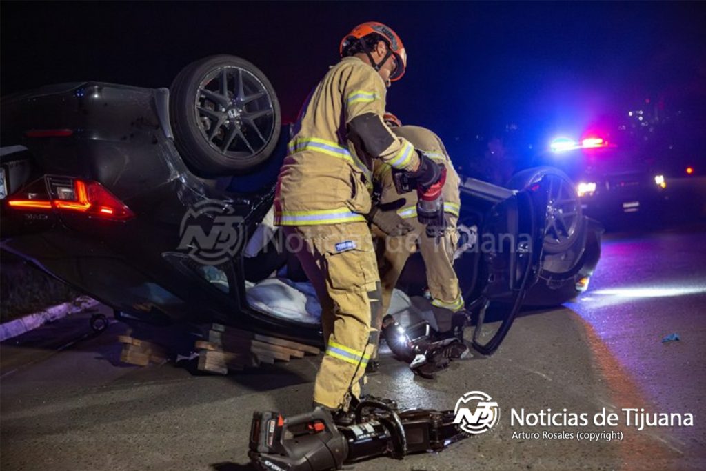 Al llegar al sitio, rescatistas encontraron un Honda Civic negro, de reciente modelo y con placas de California, volcado sobre la vialidad. El conductor, quien viajaba solo, permanecía atrapado dentro de la unidad, por lo que fue necesario utilizar equipo hidráulico, conocidas como “quijadas de la vida”, para forzar una de las puertas y lograr su extracción.