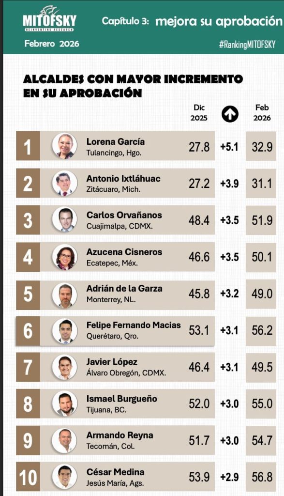 La más reciente medición de Consulta Mitofsky, dirigida por Roy Campos, evaluó la aprobación de alcaldes y alcaldesas en México, destacando a quienes registraron el mayor incremento entre diciembre de 2025 y febrero de 2026.