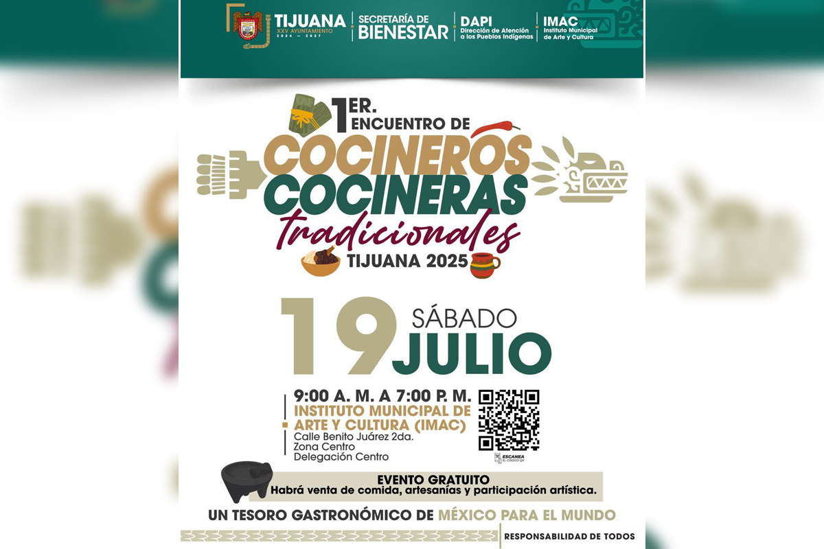 El gobierno del presidente municipal, Ismael Burgueño Ruiz, llevará a cabo el ‘1er Encuentro de Cocineros y Cocineras Tradicionales Tijuana 2025’ que tendrá como sede las instalaciones del Instituto Municipal de Arte y Cultura (IMAC), el próximo sábado 19 de julio, a partir de las 10 de la mañana.