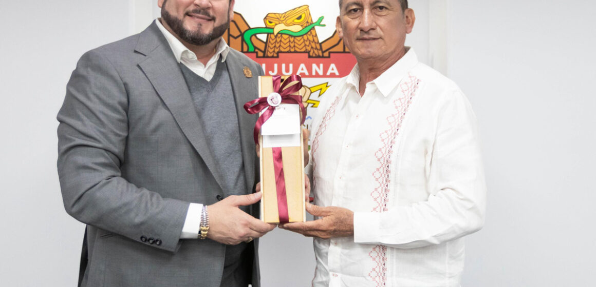 El presidente municipal de Tijuana, Ismael Burgueño Ruiz, recibió, la mañana de este lunes, en una visita de cortesía de su homólogo, José Alfredo Contreras Méndez, alcalde de Bacalar, Quintana Roo.
