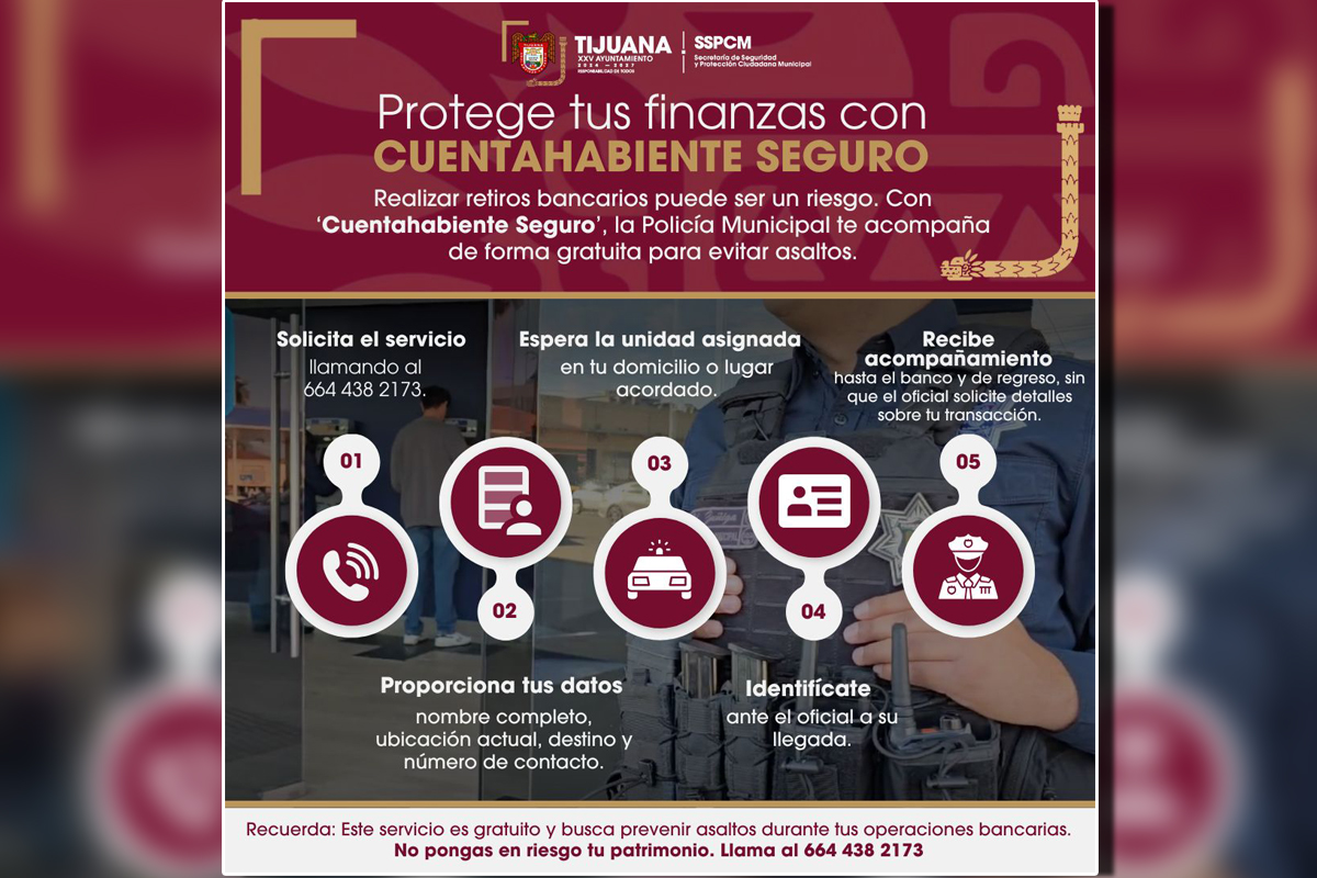 La SSPCM explicó que el objetivo principal de este programa es brindar mayor seguridad a quienes necesitan movilizar efectivo, especialmente al realizar retiros o depósitos en instituciones financieras. El acompañamiento es realizado por elementos de la Policía Municipal y puede solicitarse llamando al número telefónico 664 438 2173.