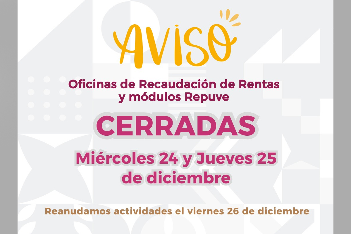 La Secretaría de Hacienda a través del Sistema de Administración Tributaria de Baja California (SAT BC) informa a la ciudadanía que las oficinas de Recaudación de Rentas y Módulos Repuve permanecerán cerradas el miércoles 24 y jueves 25 de diciembre.