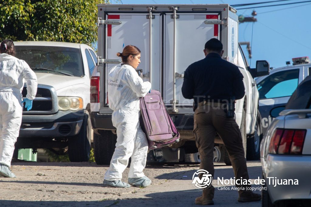 A pocos metros del lugar se encontraba una maleta de tela color morado, en cuyo interior había más restos humanos. Debajo de la maleta fue localizada una cartulina blanca con un mensaje manuscrito.