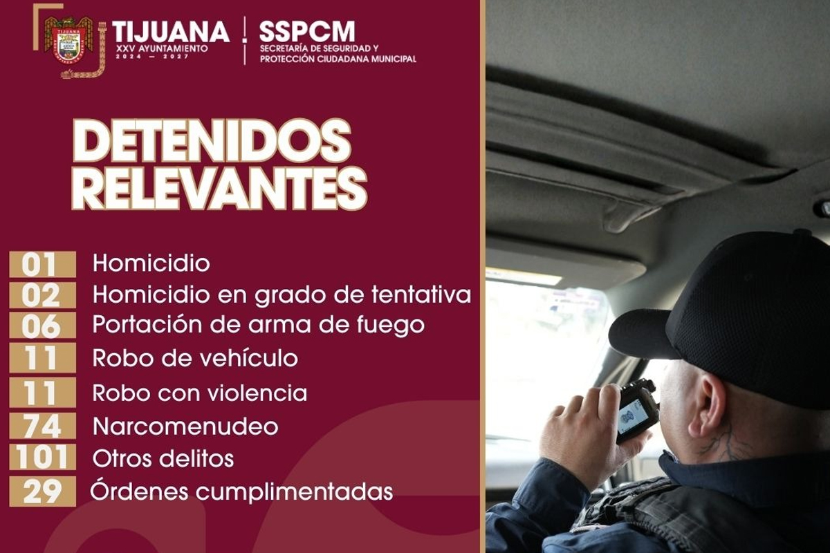 De acuerdo con la Secretaría de Seguridad y Protección Ciudadana Municipal, las detenciones derivaron de acciones preventivas y de respuesta a reportes ciudadanos recibidos a través del 9-1-1 y de las aplicaciones “Botón de Emergencia” y “Botón Morado”. Entre los casos destacan un aseguramiento relacionado con homicidio, dos por intento de homicidio, seis por portación de arma de fuego, 11 por robo de vehículo, 11 por robo con violencia y 74 vinculados al narcomenudeo. Además, 101 personas fueron detenidas por diversos delitos y 29 contaban con órdenes de aprehensión activas.