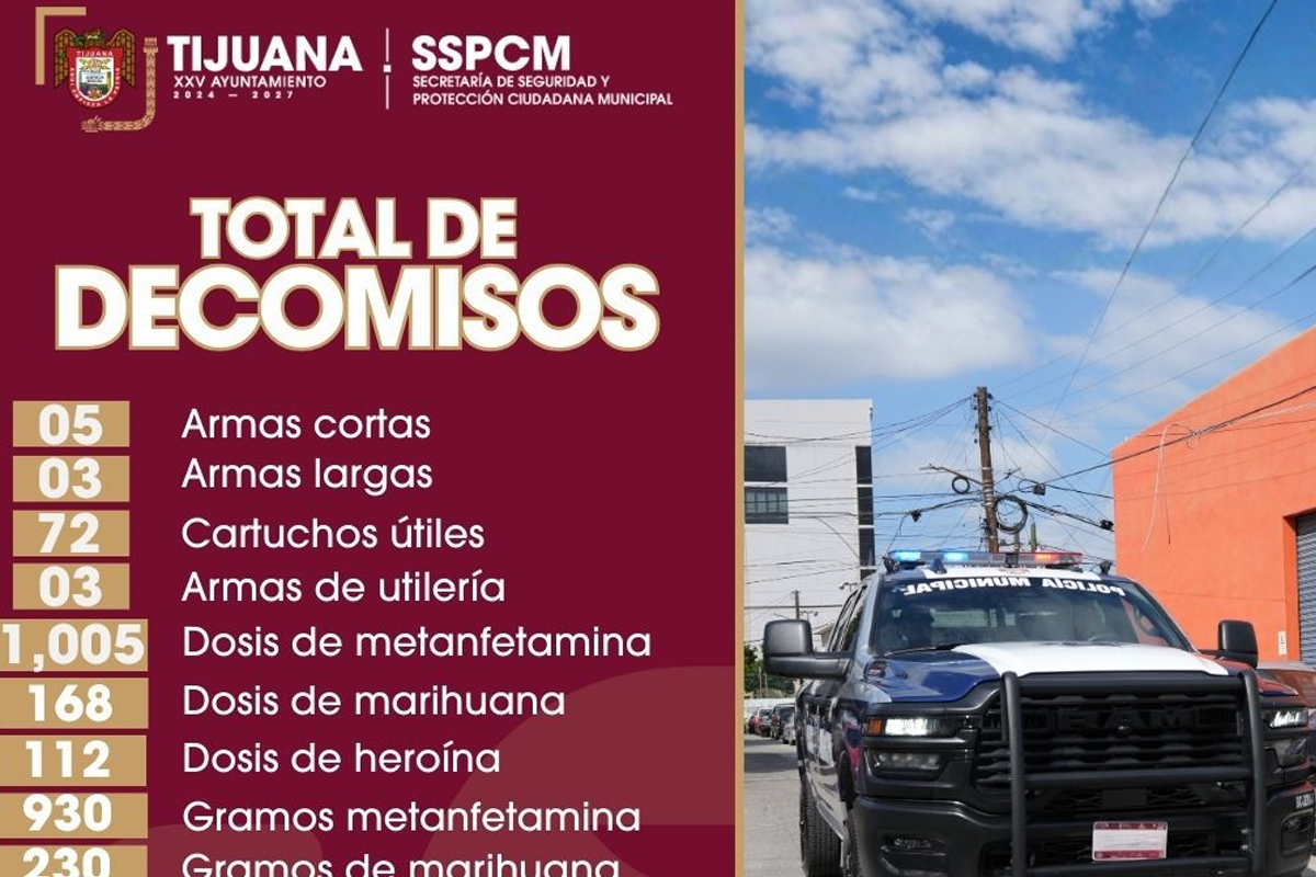 Durante este periodo, se decomisaron ocho armas de fuego, entre ellas tres largas y cinco cortas, además de diversas cantidades de metanfetamina, marihuana, heroína y cocaína. Asimismo, fueron detenidas 235 personas presuntamente involucradas en actividades delictivas.