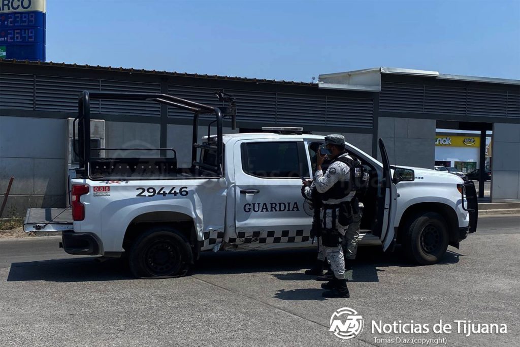 La unidad de la Guardia Nacional sufrió afectaciones visibles en una de las puertas traseras, así como una llanta reventada, mientras que el vehículo de transporte público resultó con daños en la parte frontal.
