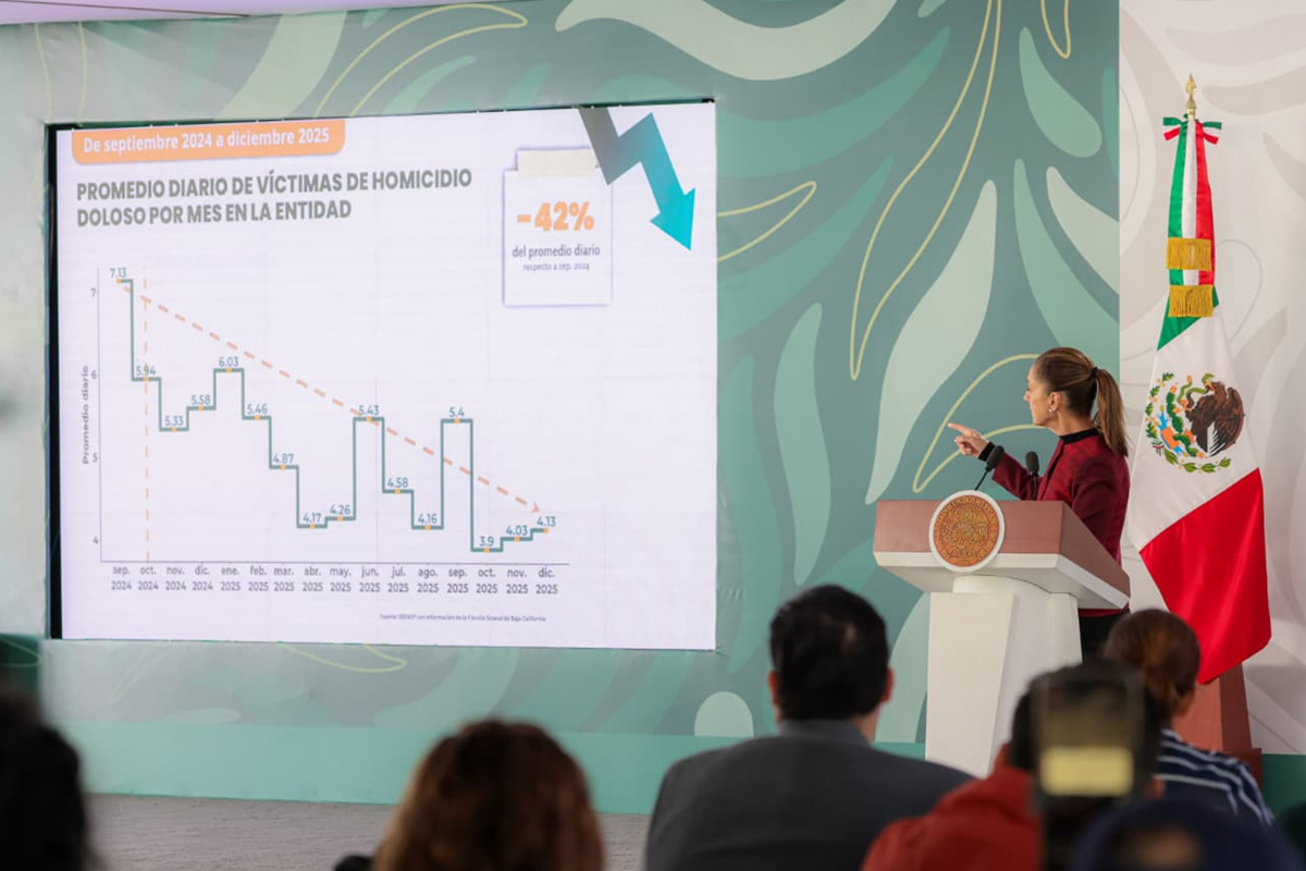 Durante la Mañanera del Pueblo realizada en Tijuana, la presidenta de México, Claudia Sheinbaum Pardo, informó que Baja California registra una reducción significativa en el promedio diario de víctimas de homicidio doloso, resultado de una estrategia de seguridad basada en inteligencia, atención a las causas y coordinación interinstitucional con el gobierno estatal.