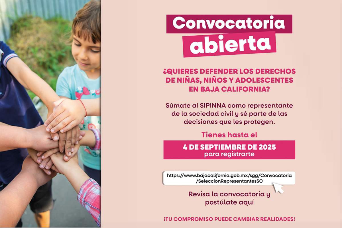 El Sistema de Protección Integral de los Derechos de Niñas, Niños y Adolescentes (SIPINNA) en Baja California invita a personas u organizaciones de la sociedad civil interesadas en la defensa y promoción de los derechos de la niñez y adolescencia, a postularse como representantes.