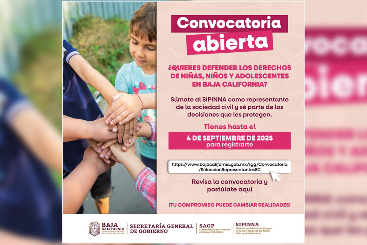 El Sistema de Protección Integral de los Derechos de Niñas, Niños y Adolescentes (SIPINNA) en Baja California invita a personas u organizaciones de la sociedad civil interesadas en la defensa y promoción de los derechos de la niñez y adolescencia, a postularse como representantes.