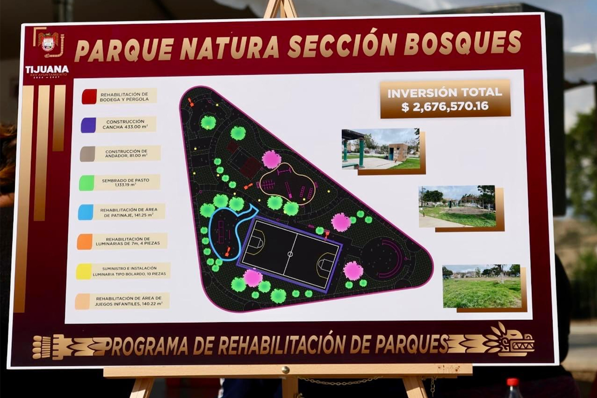 Con una inversión de 2 millones 676 mil pesos, el XXV Ayuntamiento de Tijuana, lleva a cabo trabajos de rehabilitación del Parque Natura en la Delegación La Presa Este, obras que fueron supervisadas para constatar sus avances, tal como lo ha instruido el presidente municipal, Ismael Burgueño Ruiz.