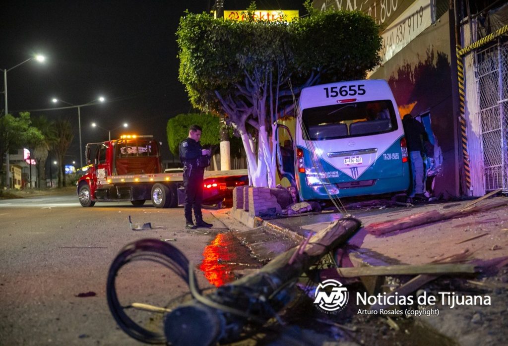 El accidente se registró sobre el bulevar Fundadores, donde la unidad con número económico 15655, que cubre la ruta Centro–Otay, primero derribó un poste de telefonía y después se impactó contra la barra perimetral del plantel educativo.