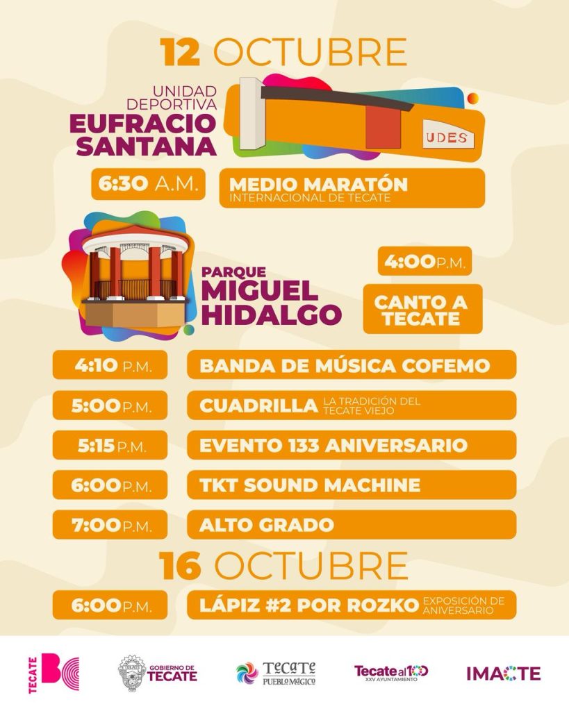 Finalmente, el domingo 12 de octubre, se realizará el Medio Maratón Internacional de Tecate desde la Unidad Deportiva Eufracio Santana. Ese mismo día, el Parque Miguel Hidalgo será sede del tradicional Canto a Tecate, acompañado de un programa artístico con la participación de la Banda de Música Cofemo, la Cuadrilla del Tecate Viejo, TKT Sound Machine y Alto Grado.