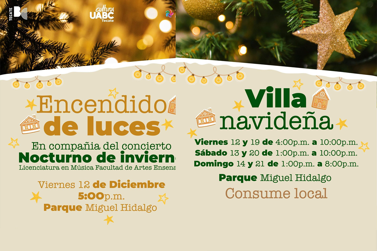 A las 5:00 p.m., se realizará el esperado Encendido de Luces, acompañado del concierto “Nocturno de Invierno”, interpretado por estudiantes de la Licenciatura en Música de la Facultad de Artes Ensenada de la UABC, quienes presentarán un emotivo repertorio con acordeón, piano, coro y orquesta que llenará de magia el corazón del Pueblo Mágico.