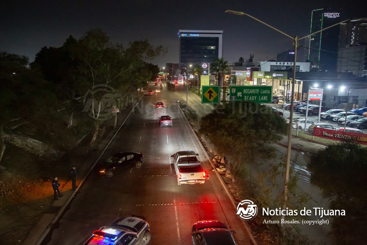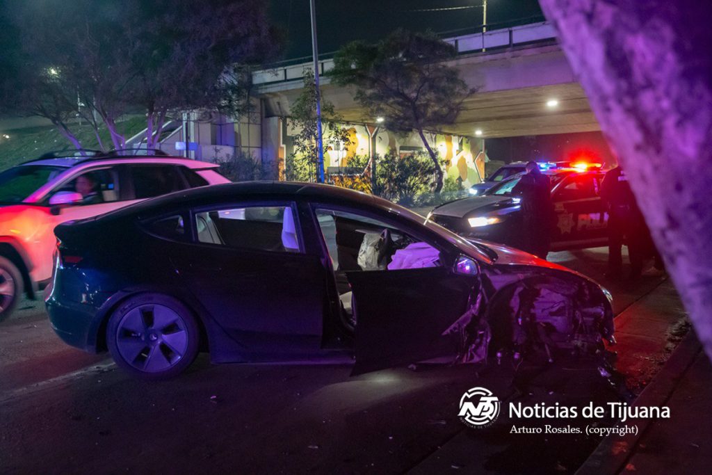 Un aparatoso accidente se registró la mañana de este lunes en la Vía Rápida Oriente, a la altura de la agencia Nissan y frente al Palacio Municipal, luego de que un Tesla color negro de modelo reciente chocara contra un señalamiento del Ayuntamiento de Tijuana y terminara atravesado sobre los carriles de la Ready Lane.