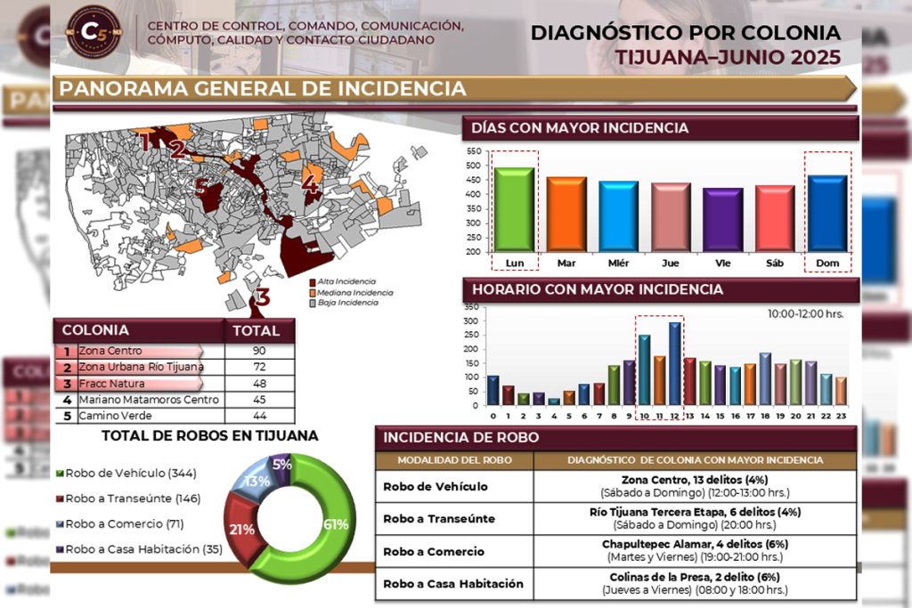 Durante junio de 2025, el municipio de Tijuana registró altos índices de robos en distintas formas, especialmente en las colonias Zona Centro, Zona Río y Fraccionamiento Natura, según reportes del C5.