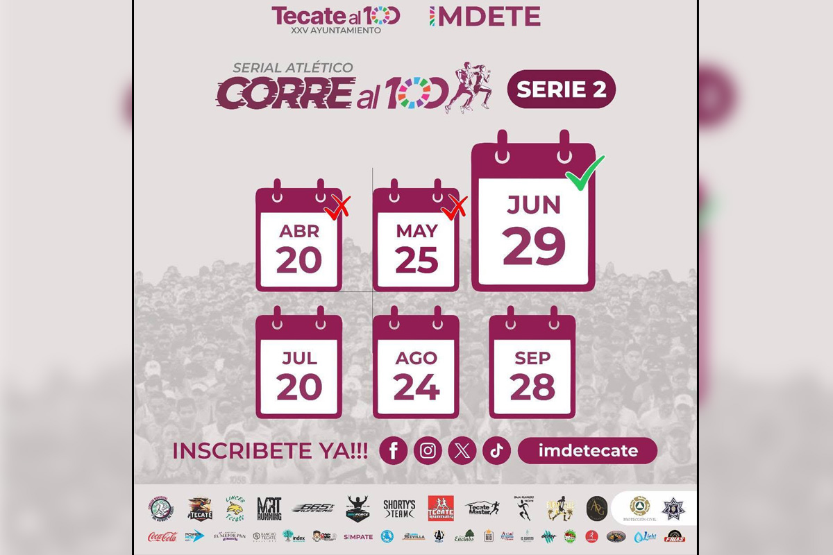 El Gobierno de Tecate, a través del Instituto Municipal del Deporte (IMDETE), informa que ya se encuentra todo listo para la realización de la tercera fecha del Serial Atlético “Corre al 100”, una actividad que busca fomentar la activación física, el bienestar y la sana convivencia entre la comunidad.