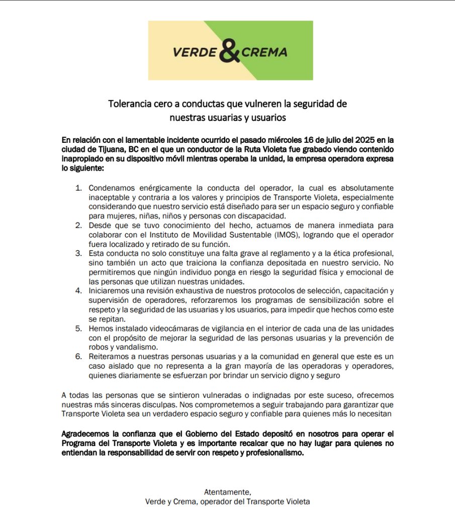 A través de un comunicado oficial, la empresa calificó la conducta del operador como “absolutamente inaceptable y contraria a los valores y principios” del servicio, el cual fue diseñado específicamente para ser un espacio seguro para mujeres, niñas, niños y personas con discapacidad.