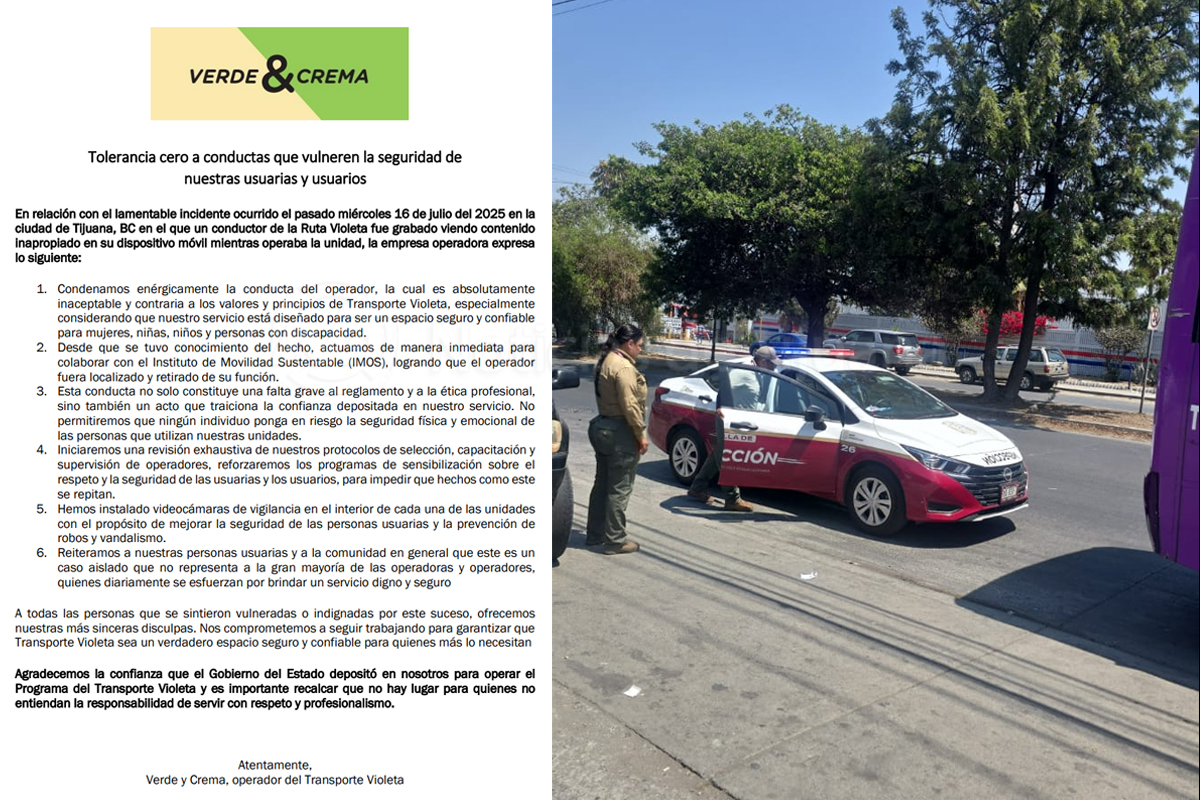 La empresa Verde y Crema, operadora del “Transporte Violeta” en Tijuana cesó de sus funciones a un conductor que fue grabado viendo contenido inapropiado en su teléfono móvil mientras estaba al volante de la unidad.
