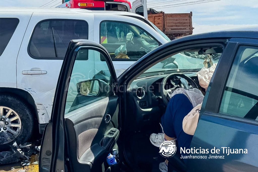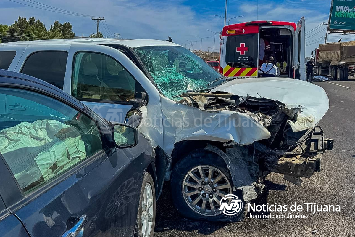 Tijuana BC. (NDT).- Un aparatoso accidente se registró sobre la carretera libre Rosarito–Tijuana, a la altura del fraccionamiento Cuesta Blanca, la mañana de este jueves 9 de abril, luego de que un tractocamión se viera involucrado en un choque con dos vehículos particulares.