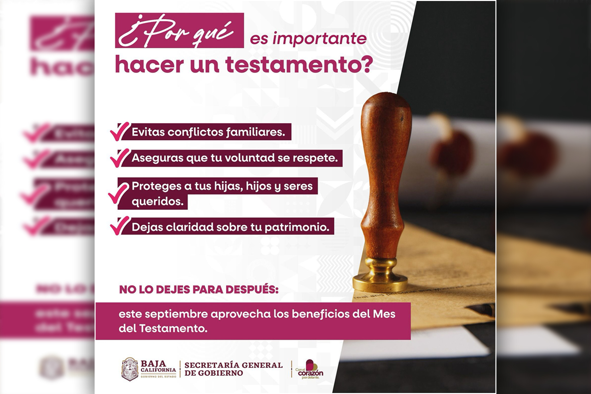 Quedan pocos días para aprovechar los beneficios del Mes del Testamento en Baja California, que concluirá este 30 de septiembre. La iniciativa busca facilitar que más personas puedan realizar este trámite con descuentos y asesoría legal.