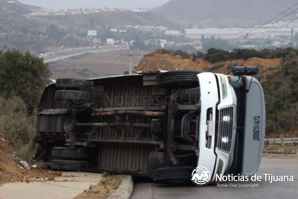 Un camión de la empresa Bajacim se volcó la mañana de este jueves en la rampa ascendente de la colonia Delicias III, cuando el operador perdió el control del vehículo.