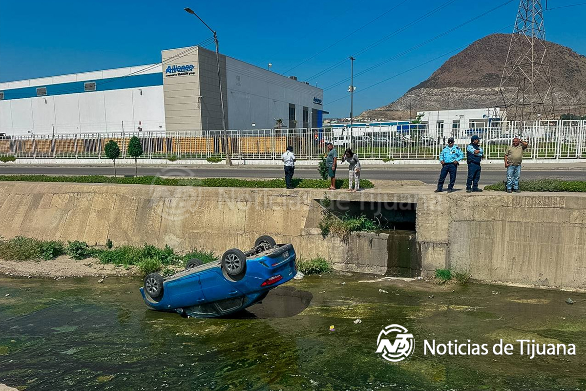 Un conductor terminó con su vehículo en volcadura dentro de la canalización tras perder el control cuando circulaba sobre el bulevar Olivas Norte, a la altura de “THX Transport”, en dirección hacia el área industrial de El Florido.